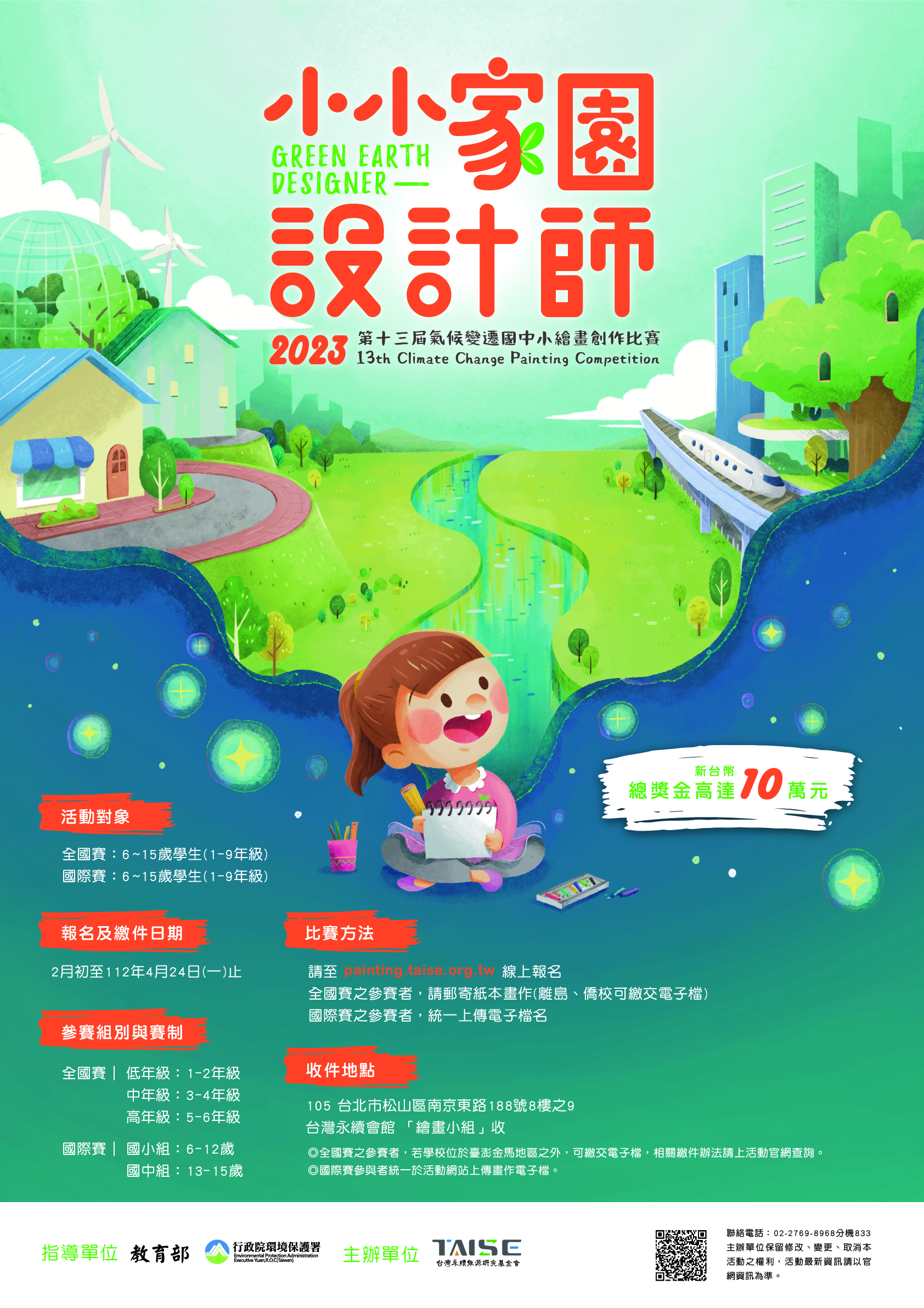 一、由教育部、行政院環境保護署指導,本會主辦之「氣候變遷國中小繪畫創作比賽」迄今已舉辦12屆,累計40國、 59,152名學子參與。本屆(第13屆)為呼應聯合國永續發展目標(SDGs)的第11項,以「小小家園設計師」為主題,提升國中小師生關注天然災害對城市造成的損傷,思考如何降低城市垃圾和空氣污染,同時重視社區文化與自然遺產等。此繪畫比賽也呼應第13項,採取氣候行動並提升大眾相關意識。