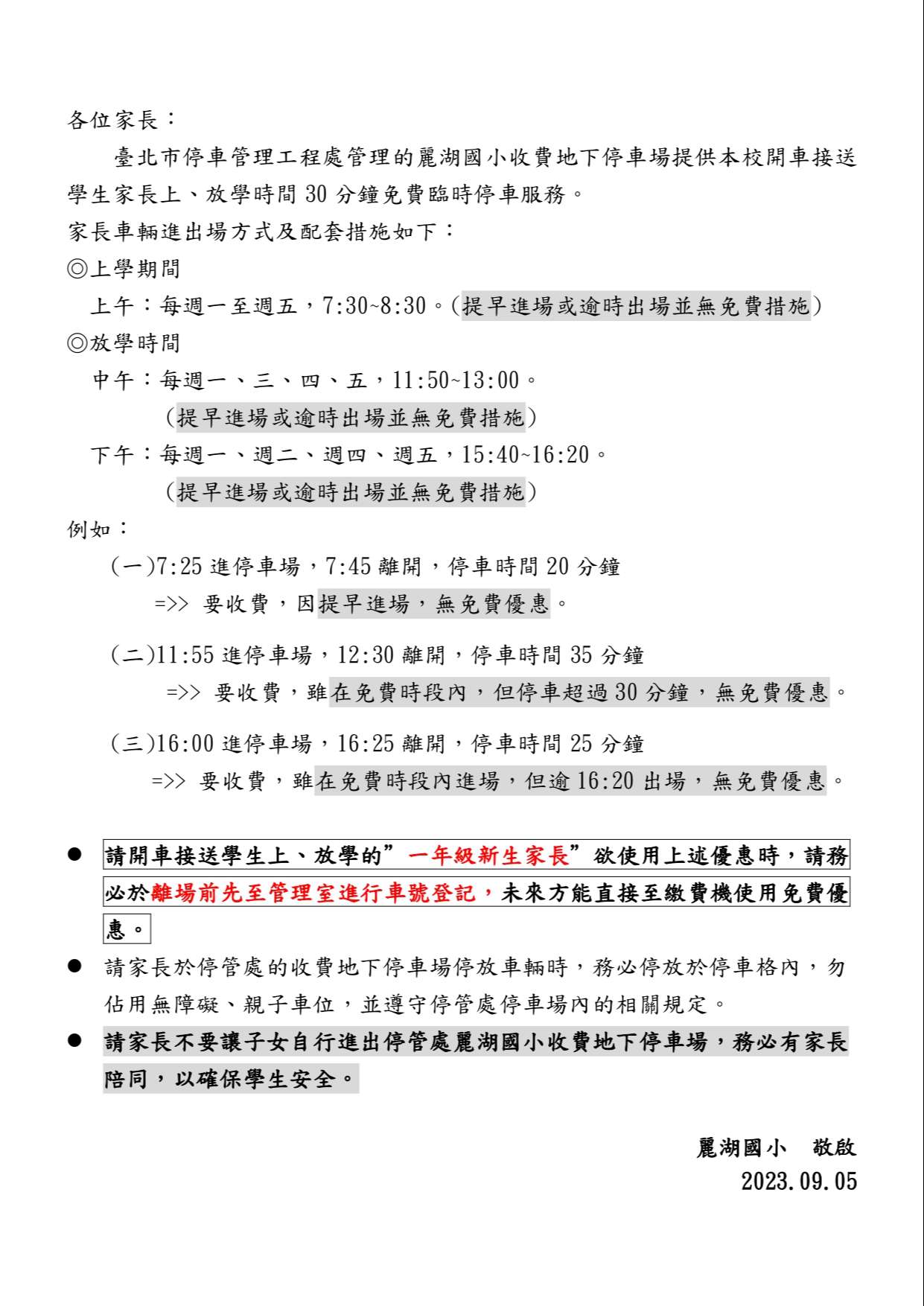 4.請家長不要讓子女自行進出停管處麗湖國小收費地下停車場,務必有家長陪同,以確保學生安全。