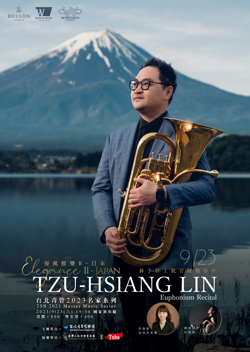 一、2023台北青管名家系列,本次規畫邀請台北青管上低音號 首席林子祥老師,攜手鋼琴合作名家許毓婷老師,精選多首日本樂曲與委託創作,呈現日式風格華麗炫技與銅管美聲。