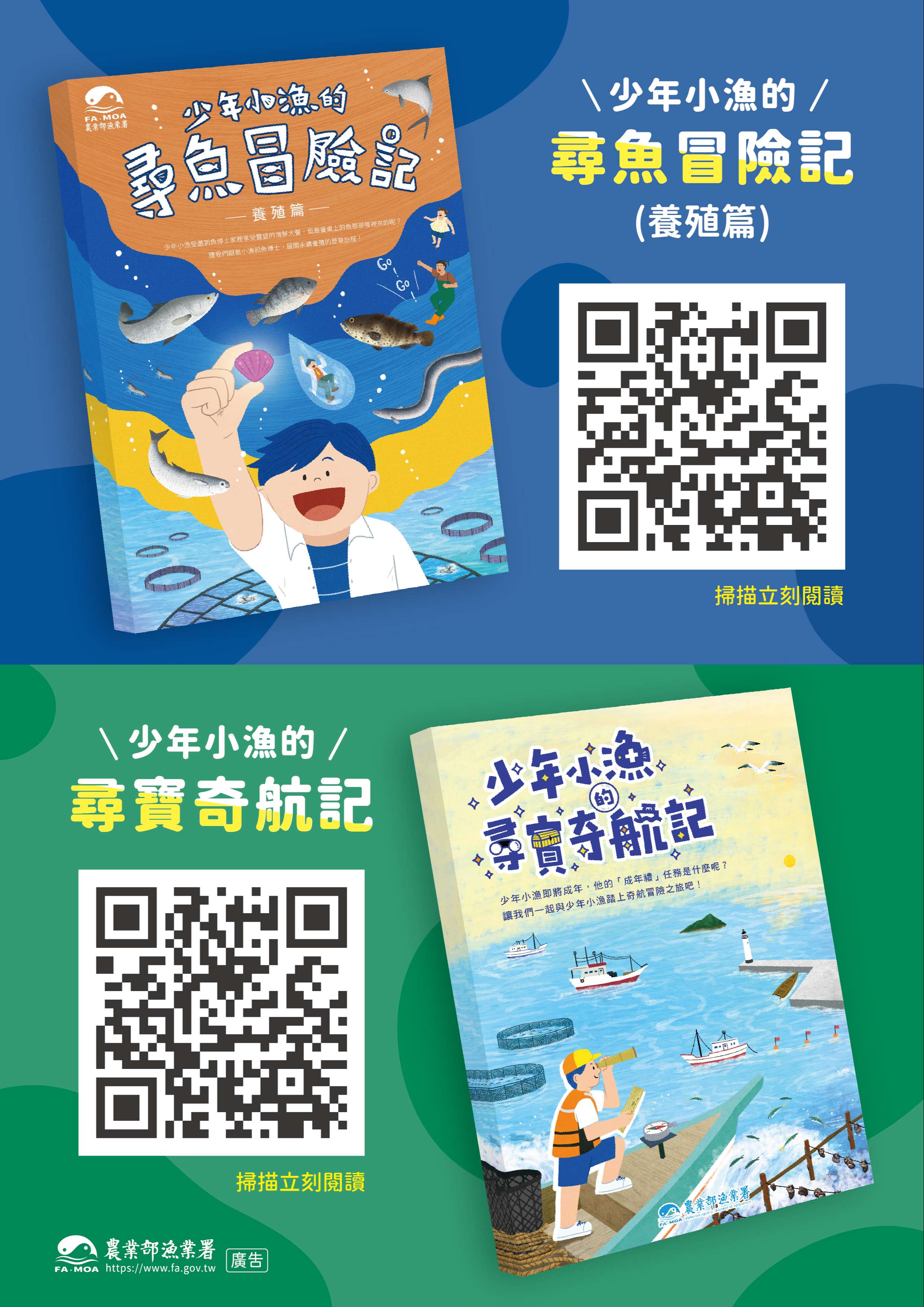 檢送農業部漁業署出版之「少年小漁的尋寶奇航記」及「少年小漁的尋魚冒險記(養殖篇)」電子繪本之宣傳圖卡1份,請教師可參考納為教材
