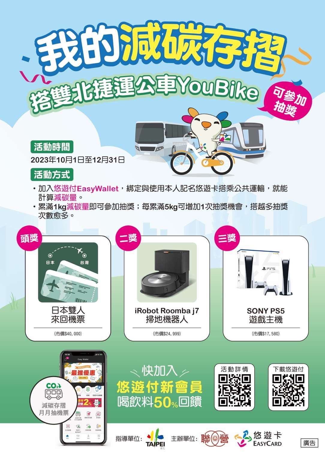 三、上開活動於112年10月1日至112年12月31日止,只要加入「悠遊付Easy Wallet」APP會員,綁定與使用本人記名悠遊卡,搭乘雙北公共交通運具(公車、捷運、輕軌及YouBike)就能計算減碳量。累計滿1kg減碳量即可獲得當月抽獎資格1次,每累計滿5kg,可再增加1次抽獎機會,累計滿10kg則多2次,以此類推,搭乘公共運輸越多,就有越多中獎機會。
