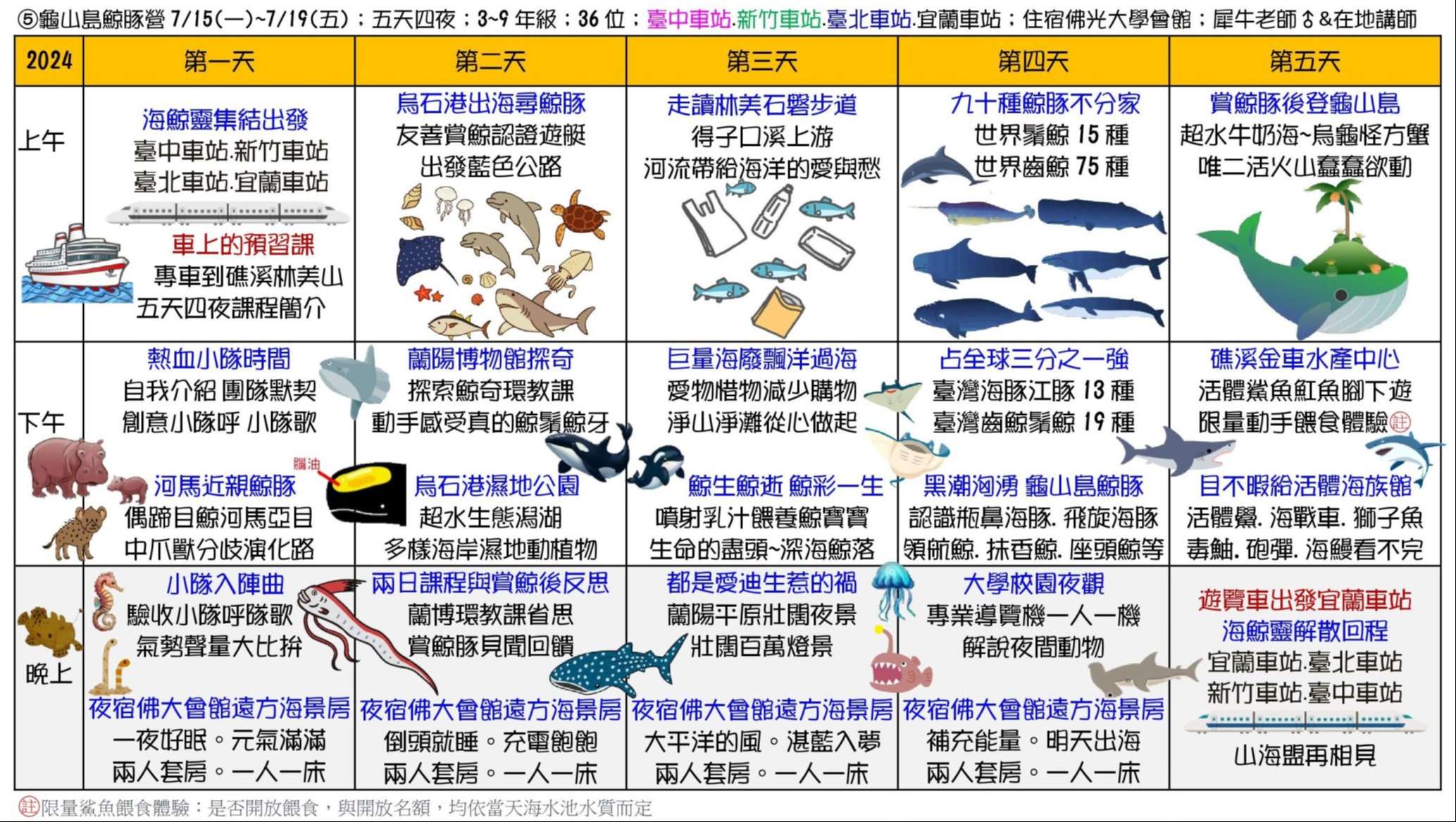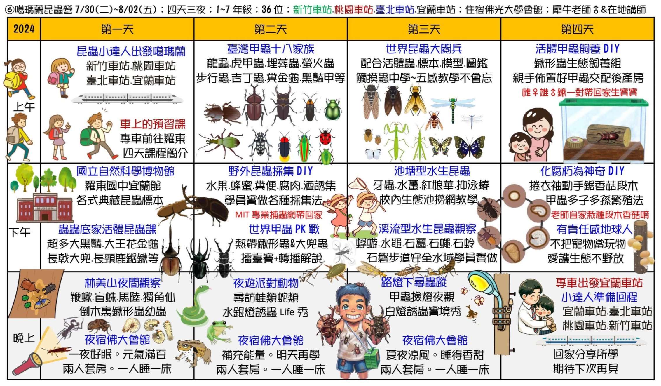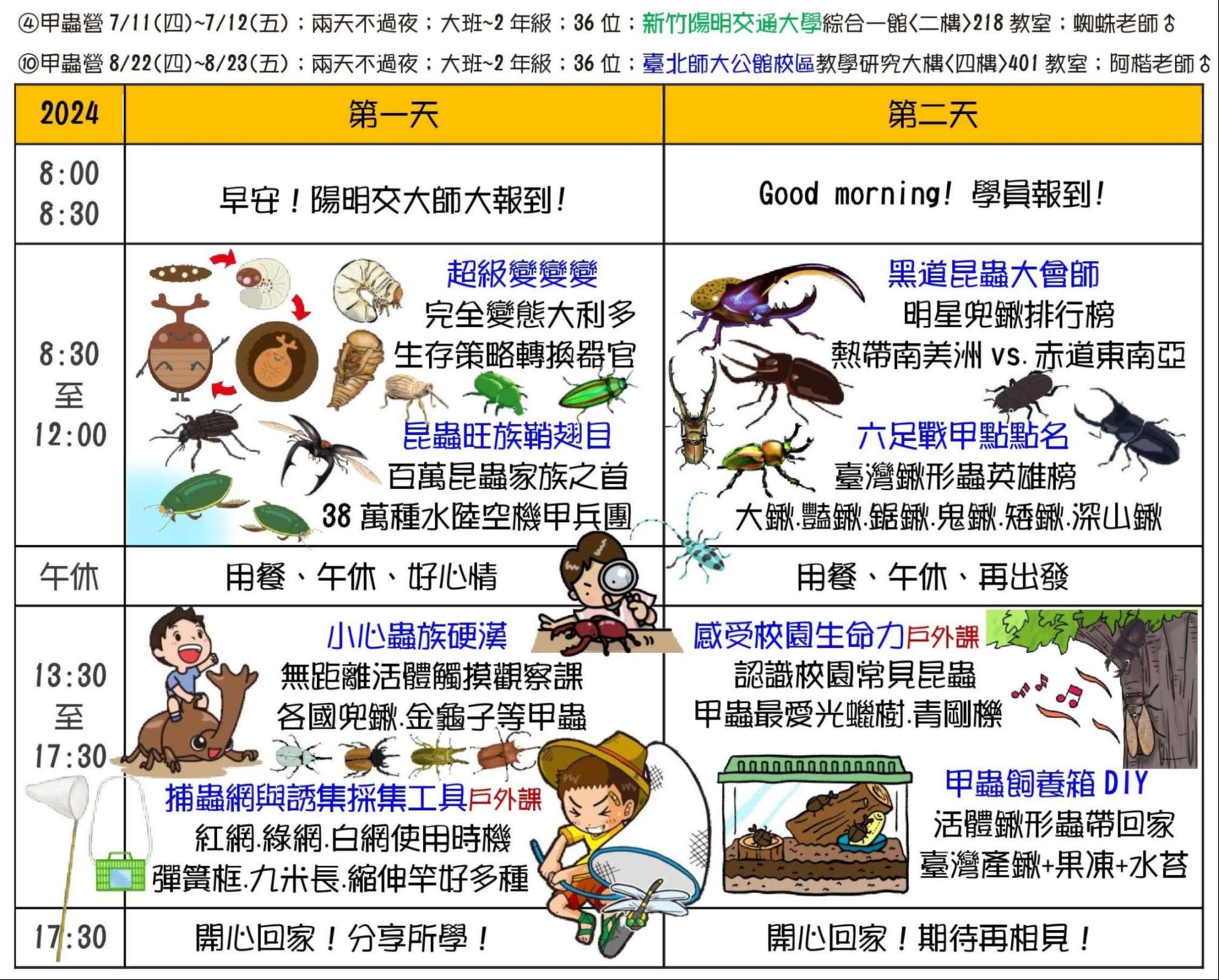 三、課程主題:蘭陽山野求生營、南臺灣諾亞方舟營、龜山島鯨豚營、噶瑪蘭昆蟲營、宜蘭生態農場營、動力科學營、甲蟲營、綠世界六足昆蟲營。