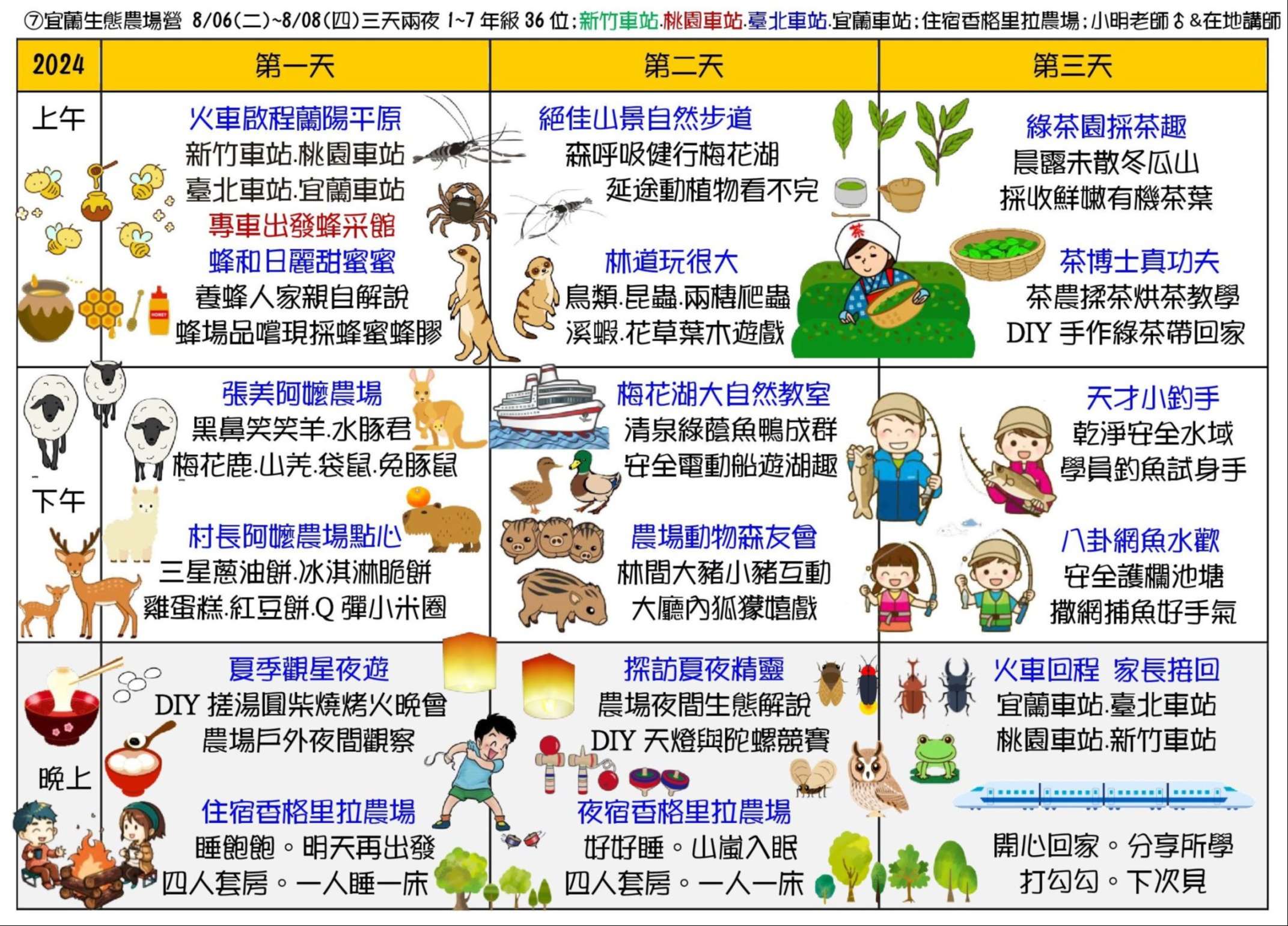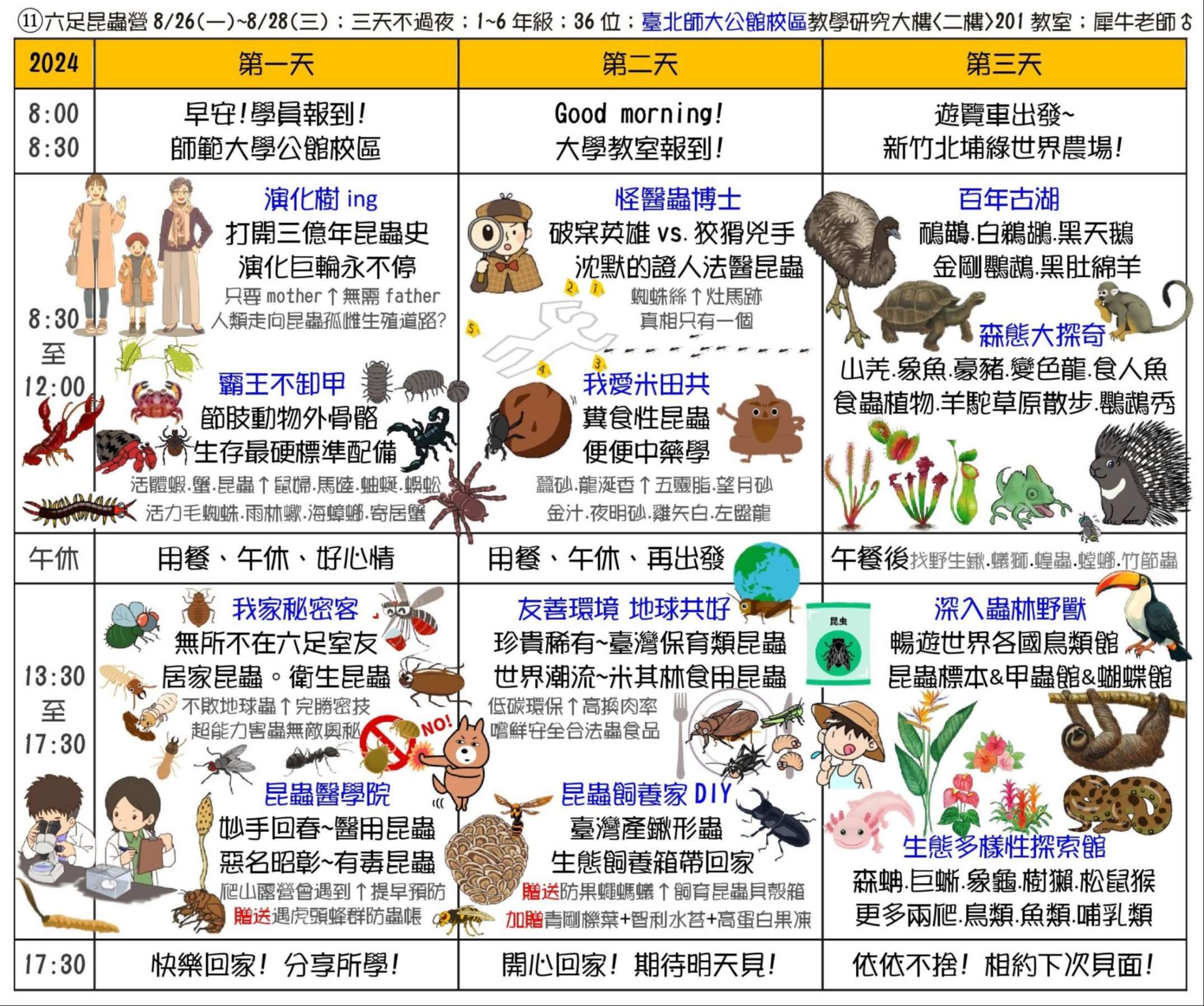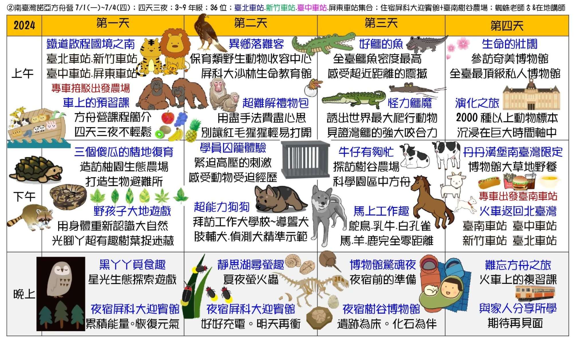 三、課程主題:蘭陽山野求生營、南臺灣諾亞方舟營、龜山島鯨豚營、噶瑪蘭昆蟲營、宜蘭生態農場營、動力科學營、甲蟲營、綠世界六足昆蟲營。