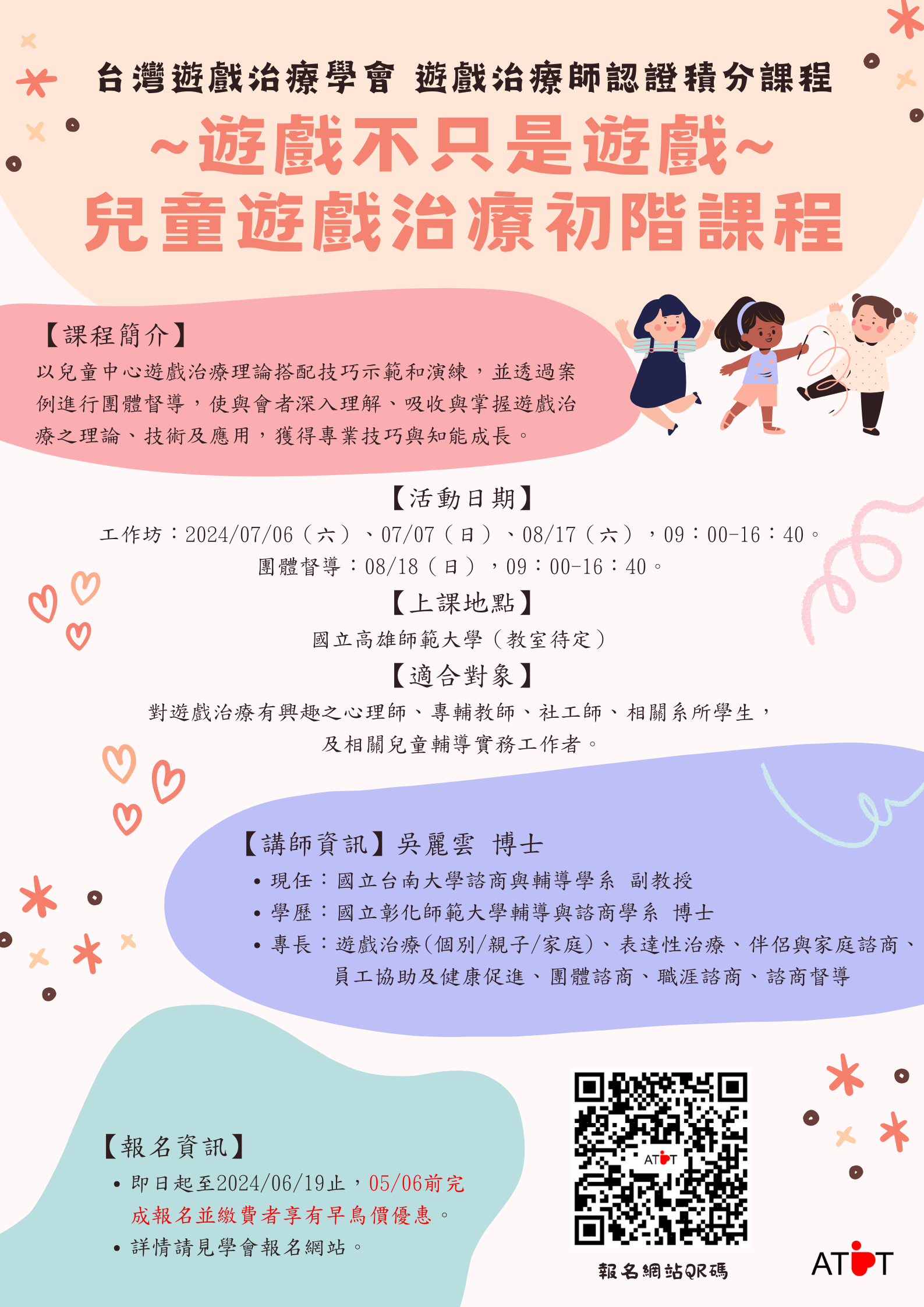 一、2024台灣遊戲治療師認證積分課程『遊戲不只是遊戲』兒童遊戲治療入門課程活動及時間。