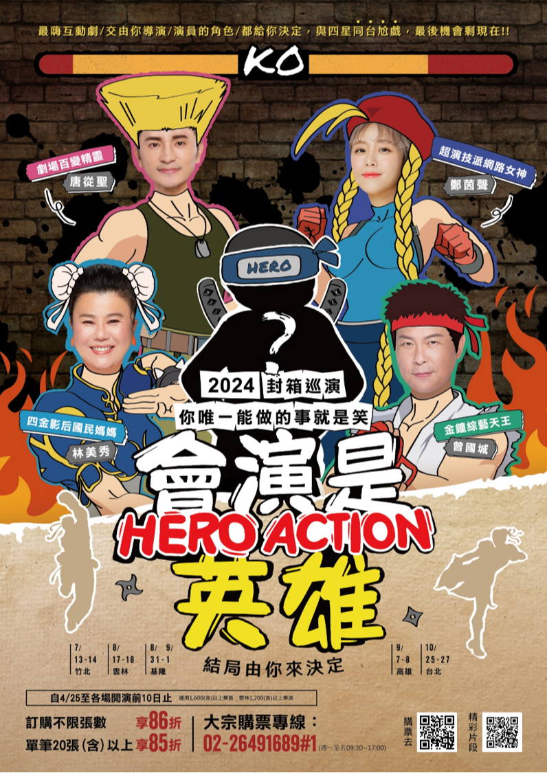 一、2022年9場的巡演,2023年破千萬的票房,2024年《會演是 英雄》封箱巡演,再創紀錄。一齣集結明星脫口秀、現場多媒體互動投票、表演訓練及經典戲劇的新型態演出,沒有劇本的即興互動不僅充滿變數、笑料與驚喜外,現場每位觀眾還能自由選擇演出劇本與結局。透過輕鬆有趣的演出,讓學子們從中見證明星們多年來從事演藝的深厚功力及經驗分享,包含克服上台恐懼、口語表達、活用聲音與表情、邏輯思考組織內容、溝通邏輯等等面向,掌握到輕鬆幽默的說話藝術。