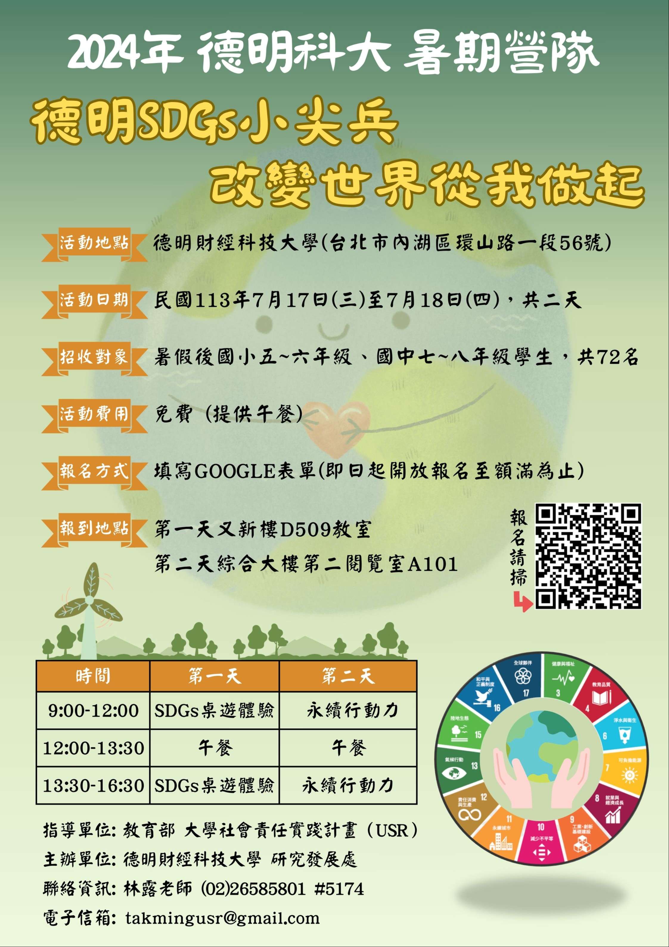 四、檢附營隊簡章及宣傳海報電子檔各1份,若有問題,請洽活動聯絡人:林露老師,電話:02-26585801轉5174,電子信箱:takmingusr@gmail.com。