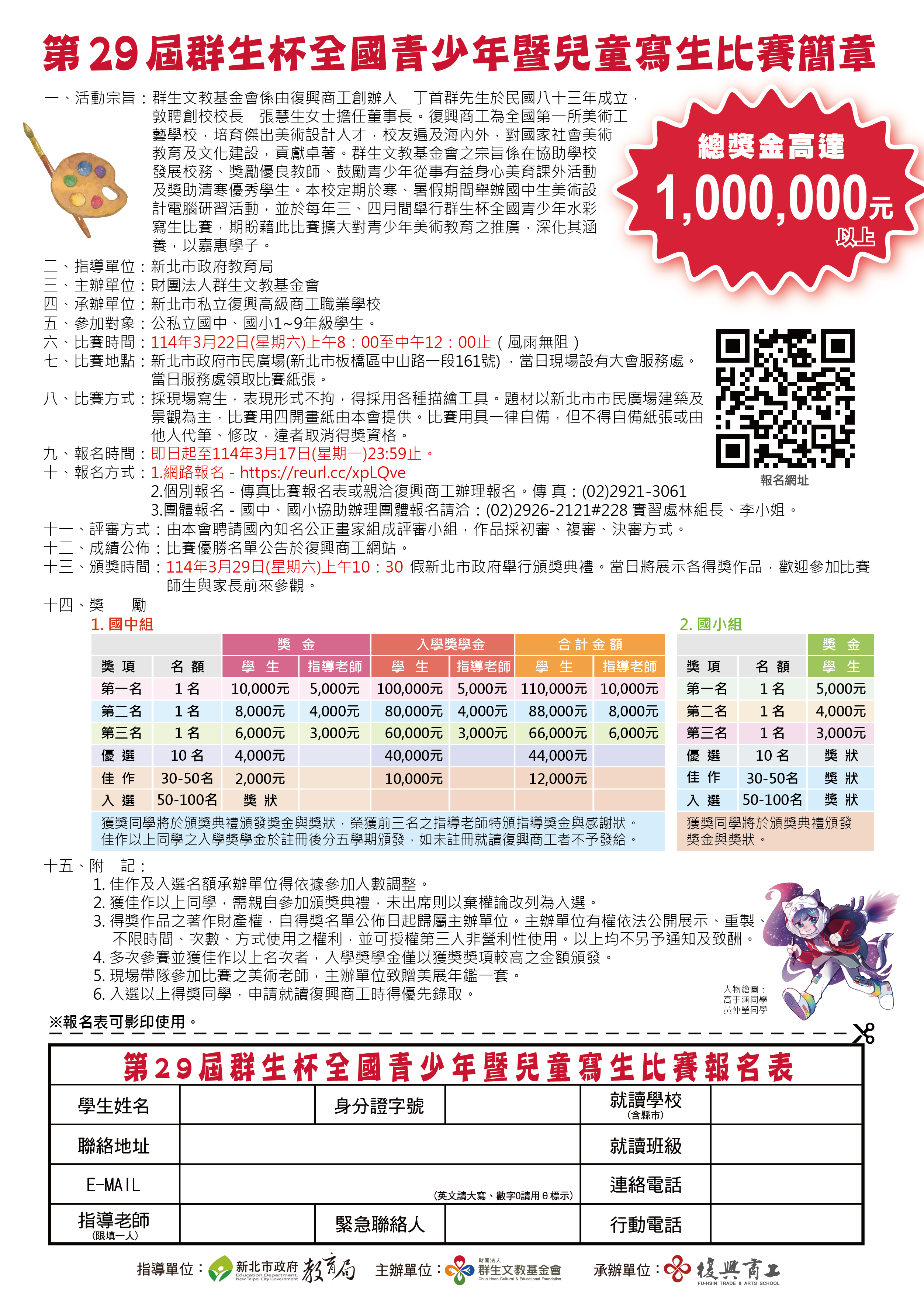 一、活動宗旨:群生文教基金會係由復興商工創辦人 丁首群先生於民國八十三年成立,敦聘創校校長 張慧生女士擔任董事長。復興商工為全國第一所美術工藝學校,培育傑出美術設計人才,校友遍及海內外,對國家社會美術教育及文化建設,貢獻卓著。群生文教基金會之宗旨係在協助學校發展校務、獎勵優良教師、鼓勵青少年從事有益身心美育課外活動及獎助清寒優秀學生。本校定期於寒、暑假期間舉辦國中生美術設計電腦研習活動,並於每年三、四月間舉行群生杯全國青少年水彩寫生比賽,期盼藉此比賽擴大對青少年美術教育之推廣,深化其涵養,以嘉惠學子。
