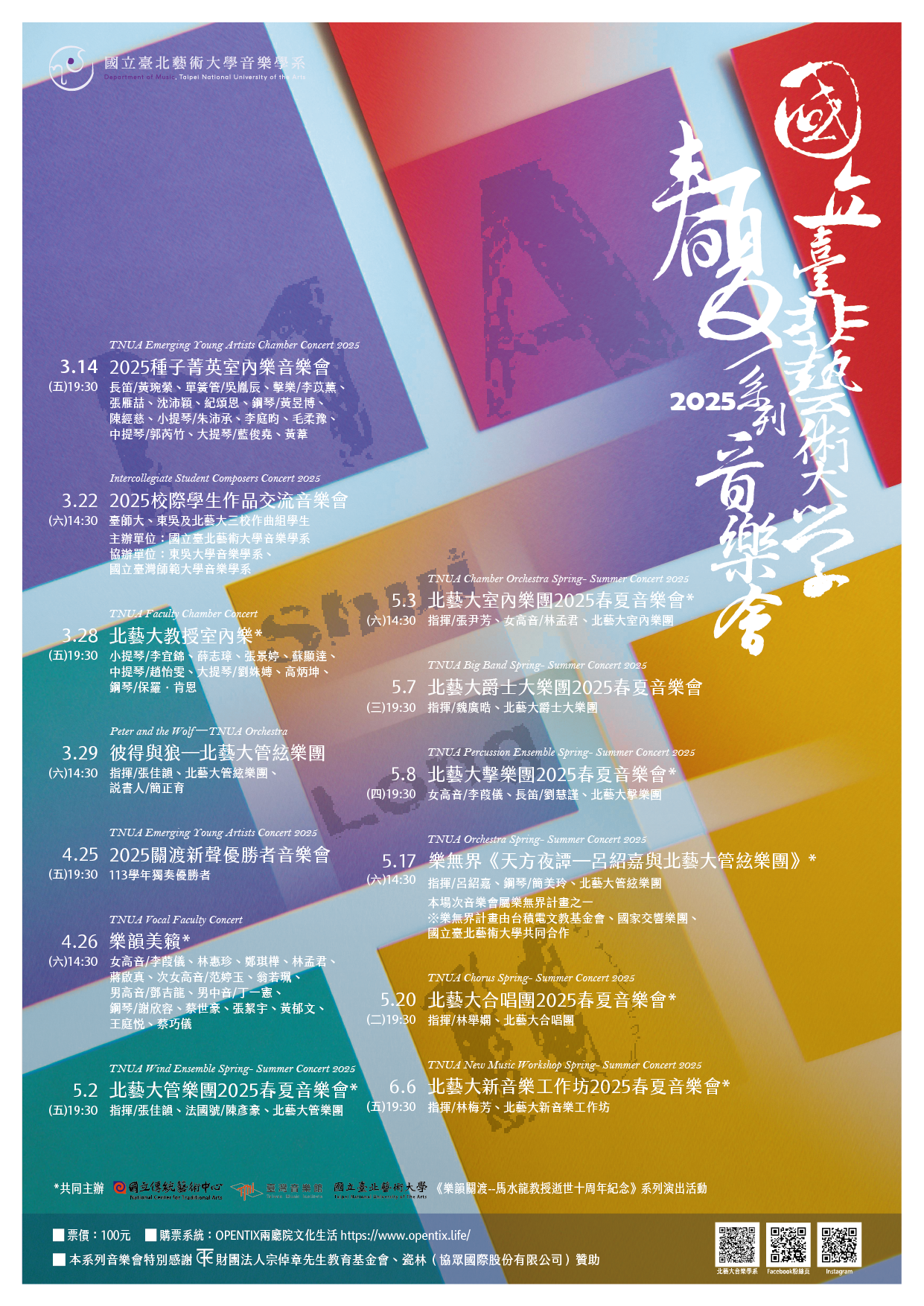 一、音樂會共13場,北藝大展演藝術中心音樂廳(臺北市北投區學園路一號)舉行。