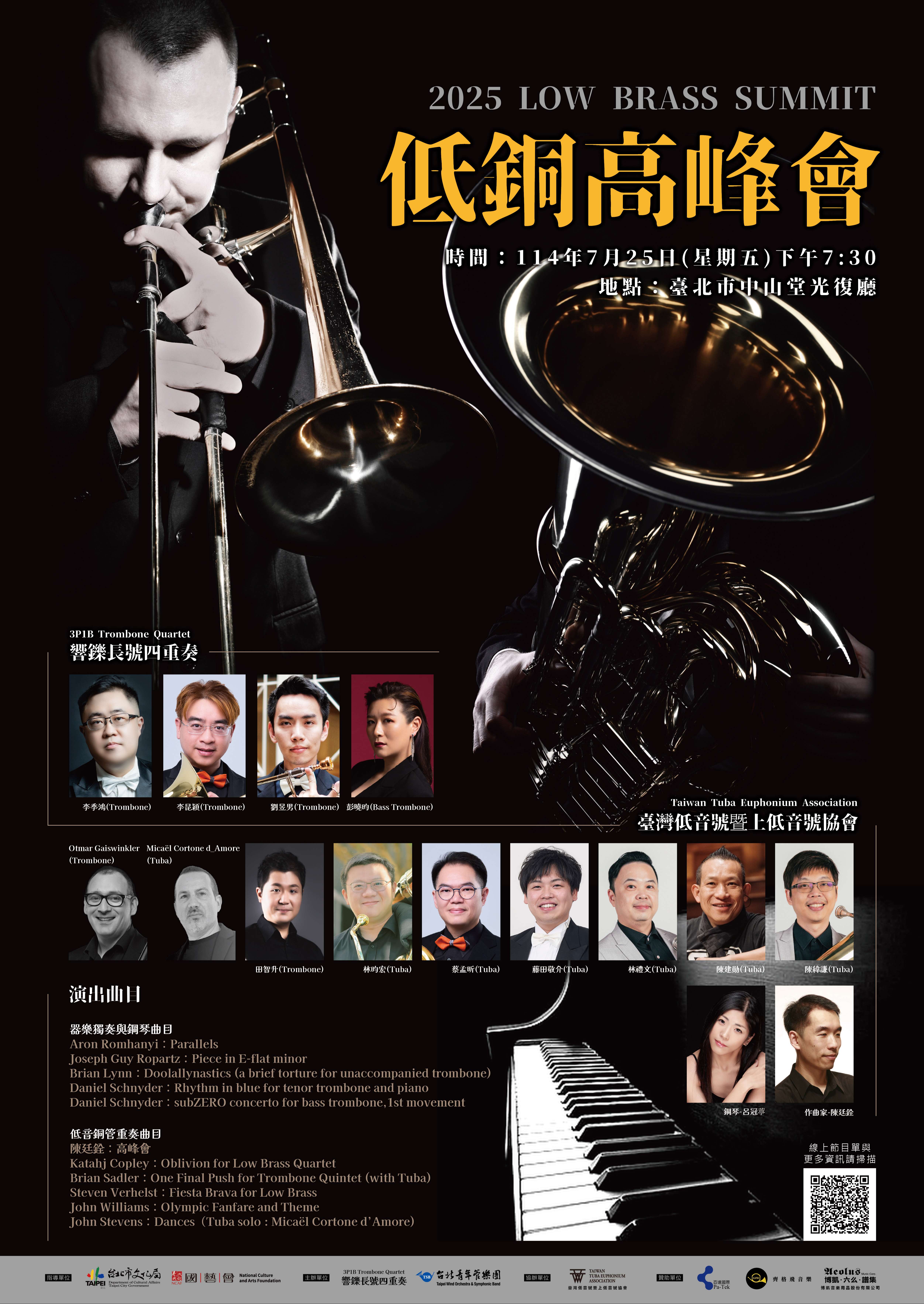 一、由臺灣職業樂團長號首席與國家交響樂團低音長號彭曉昀老師組成的響鑠長號四重奏,將帶來一連串精彩萬分的長號獨奏與重奏曲目。更邀請國內外低音號演奏名家一同參與,是一場不可錯過,精彩萬分的低銅音樂饗宴