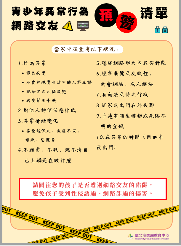 為協助家長關心數位環境對青少年的風險,面對「網路交友」與「性侵誘騙」的陷阱,平時應建立良好的親子關係,海報內容列有10項實用之網路交友警訊,以察覺孩子是否已陷入網路交友的困境。