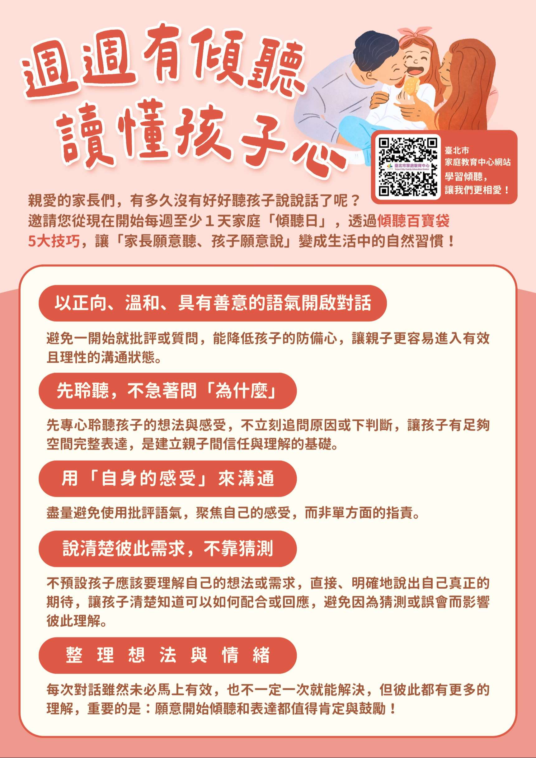 三、本市「傾聽日」相關資源將陸續上架於本市家庭教育中心網站(網址:https://family.gov.taipei/Default.aspx),歡迎多加運用。