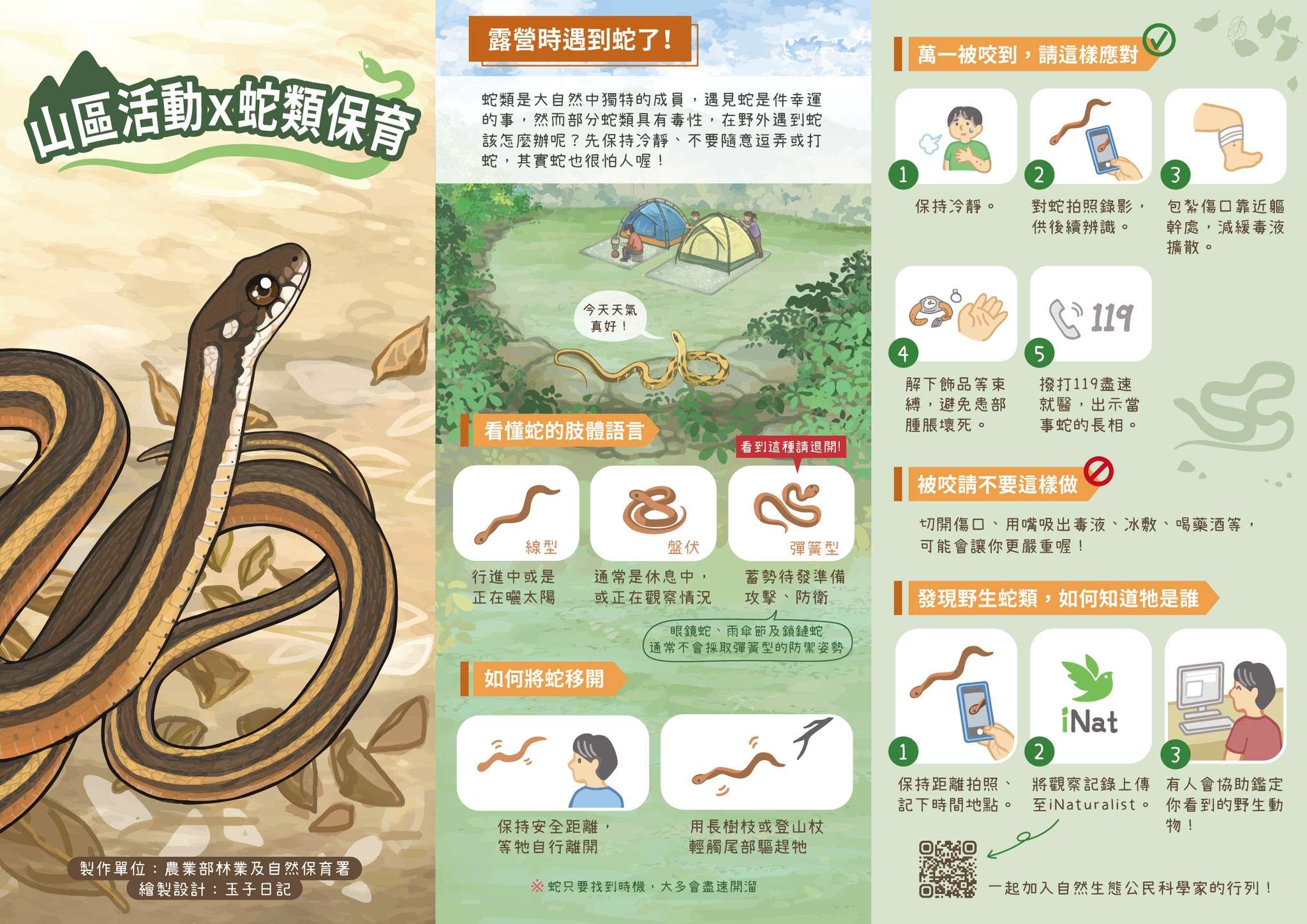 三、檢送「山區活動×蛇類保育」摺頁電子檔 1 份,或可參考 該署自然保育網「在山上遇到蛇怎麼辦」之資訊(網址: https://conservation.forest.gov.tw /0002325)。