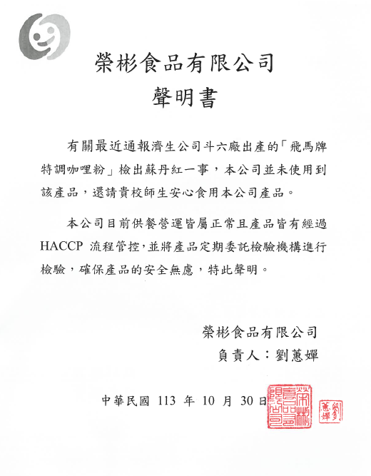 因應113.11.05起校園午餐禁用咖哩粉- 榮彬食品聲明